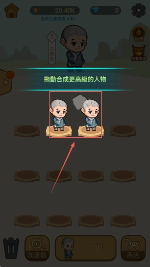 借助加速器提高合成效率,拖拽相同人物进行合并,从而得到更高级的角色。