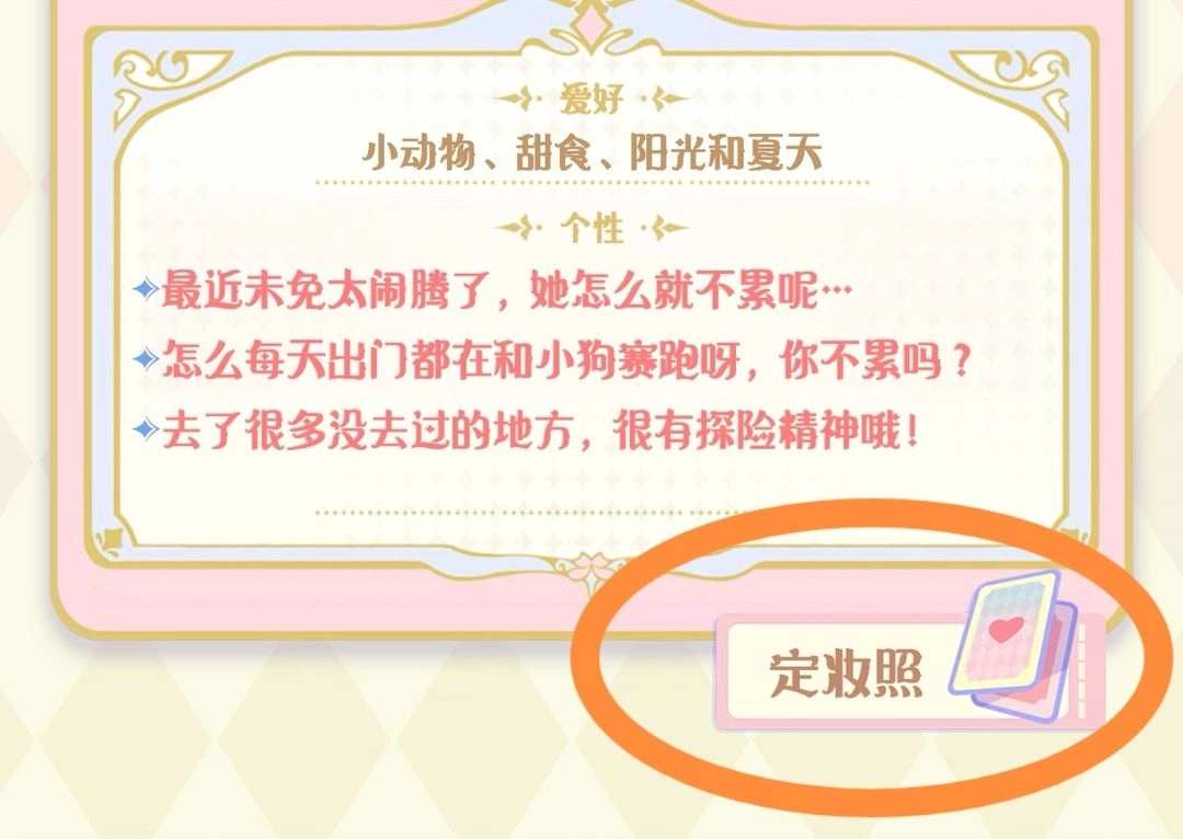 角色卡在仓库使用后,可在角色界面右下角的定妆照功能中进行更换(悄悄说一句:换成万圣节主题的图片后,背景音乐也会跟着变化哦,如果把三张都换回初始图片,背景音乐就会恢复原样啦)。另外,角色界面里的描述内容也会随着女儿的心情变化而改变。